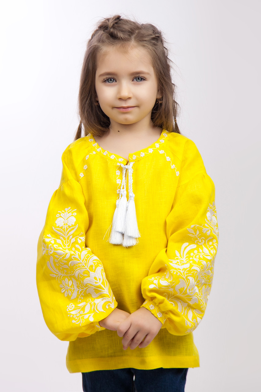 Вишиванка для дівчинки з вишивкою "Дерево життя" на жовтому льоні — це чудовий вибір, який поєднує в собі традиційну українську вишивку та яскравий кольоровий акцент. Жовтий колір льону надає сорочці виразності та енергії, а вишивка "Дерево життя" символізує ріст, розвиток та гармонію.