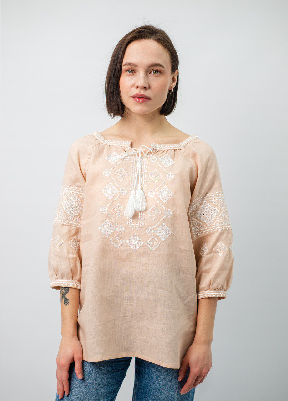 Жіноча вишиванка "Віско" пошита з натурального не вибіленого (сірого) льону та прикрашена ніжним візерунком у білому кольорі. Вільний крій, рукав 3/4, натуральна приємна до тіла тканина, і не помітний орнамент робить цю модель універсальною для будь-якого гардероба.
