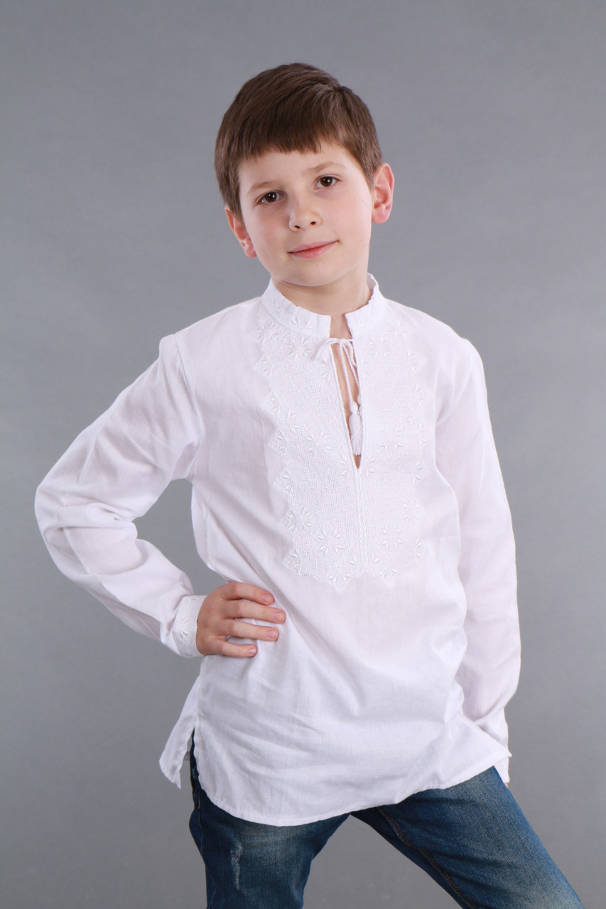 Біла дитяча вишиванка для хлопчика з довгим рукавом вишита білими нитками машинним способом. Вишивка білими нитками по білому полотну виглядає дуже ошатно і стильно. Ця модель ідеально підійде на будь-яке торжество або для звичайної прогулянки. Візерунок розташований на передній планці та комірі - стійці вироби та на манжетах. Комір - стійка на зав'язках кисточках білого кольору.